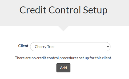 To set up a procedure click the Finance tab on the left of the screen, then click on Credit Control Setup. You can select your client, and then click add to open the Add a Procedure form.
