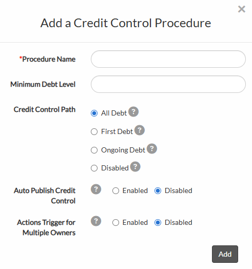 Credit Control is a means of monitoring and actioning any unpaid debts or bills on a consumer account. Credit Control is set up within procedures that you can set up specific paths for your Credit Control process to follow. Each procedure will then consist of the various stages, and actions added to each stage. This may be in the form of a letter, email or other form of correspondence.