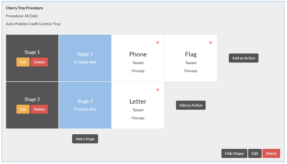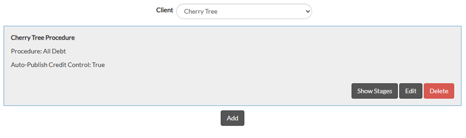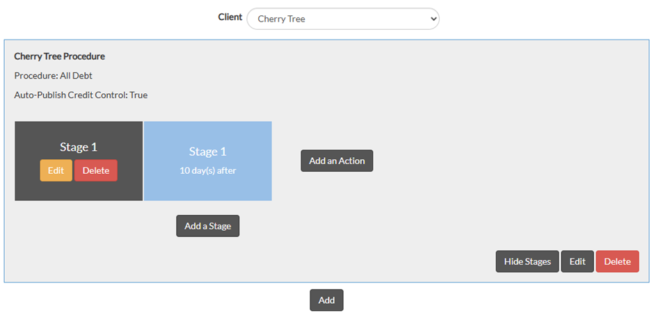 Credit Control Stages are set up within a procedure. You can add as many stages as you need to, for when a payment is due or overdue, based on the payment terms you have chosen at the point of client setup.