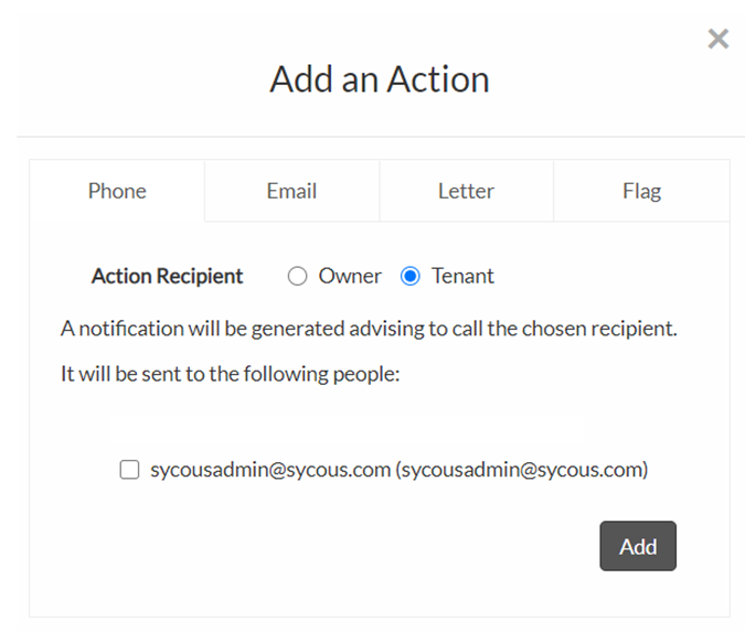 Select whether you would like to generate the action against the Owner or the Tenant account, complete any further required fields, then click Add to save the action to the stage. More information regarding each action type and how they work can be found on our help article here.